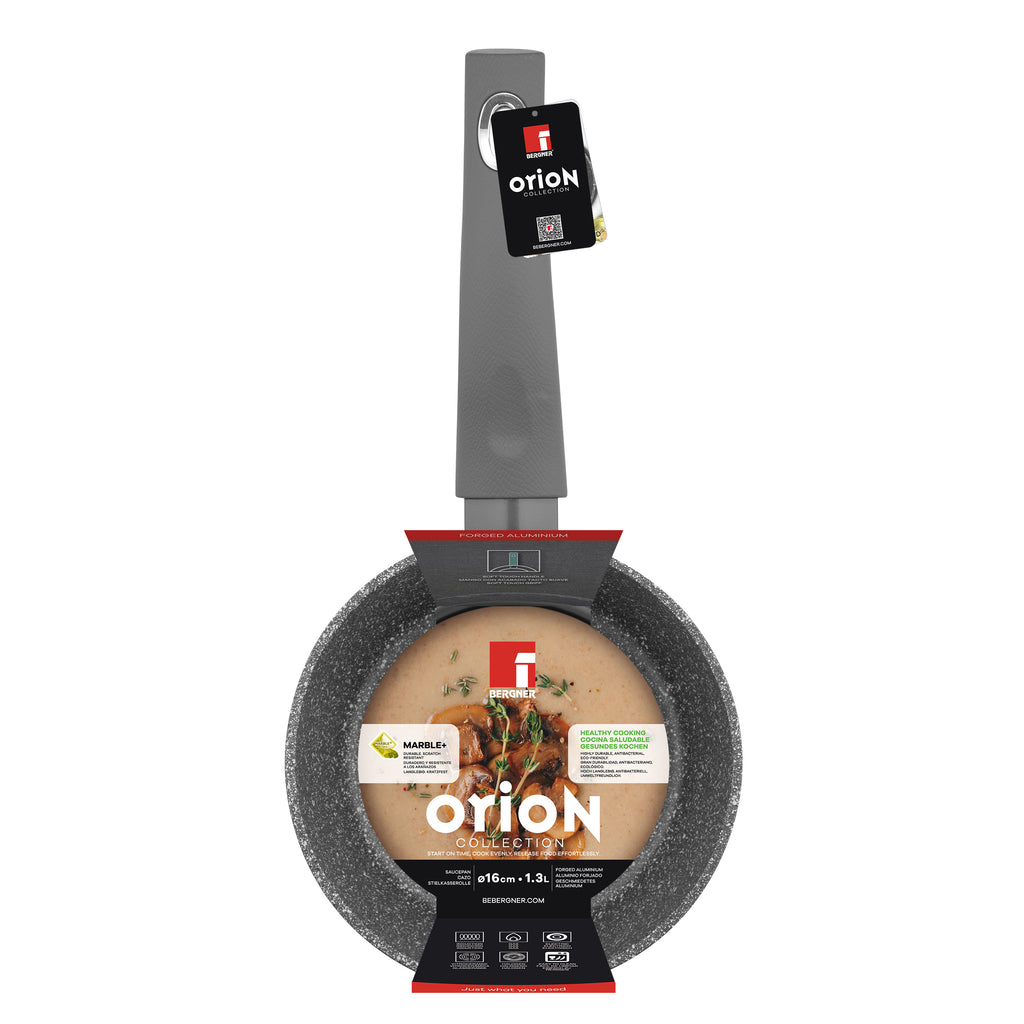 Orion nace para destacar con su impresionante revestimiento de mármol y anillos de inserción brillantes. Siente las texturas del mango con tacto suave, disfruta de la cocción y limpieza sin esfuerzo con nuestro recubrimiento antiadherente y ¡dale a tu cocina un punto culminante instantáneo!