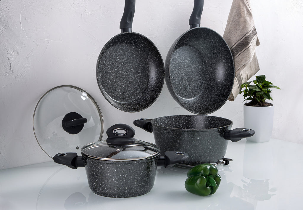 Orion nace para destacar con su impresionante revestimiento de mármol y anillos de inserción brillantes. Siente las texturas del mango con tacto suave, disfruta de la cocción y limpieza sin esfuerzo con nuestro recubrimiento antiadherente y ¡dale a tu cocina un punto culminante instantáneo!